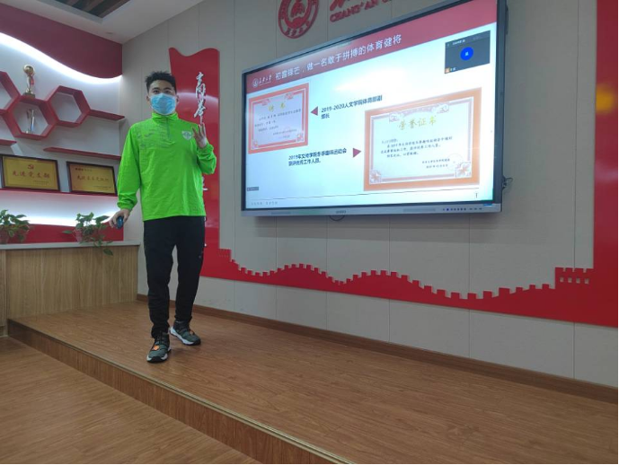 人文学院竞技之星获得者、国家一级运动员朱子轩在经验分享中,他表示自己从小热爱体育,足球是他的长项,他认为一个热爱体育活动的人不仅仅是爱参加的人,也应该是能组织的人。他建议同学们要做自己最擅长的事,希望同学们也能为自己热爱的事业努力奋斗。