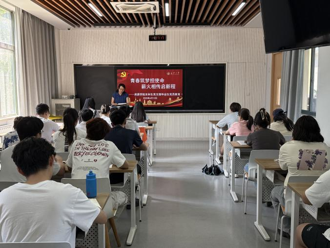 本科生第二党支部于北校区wx3207教室开展“青春筑梦担使命,薪火相传启新程”2025届毕业生党员主题教育党课。本次活动旨在通过理论学习与实践引导,强化毕业生党员的党性修养,为即将奔赴人生新征程的青年党员上好“最后一堂党课”。